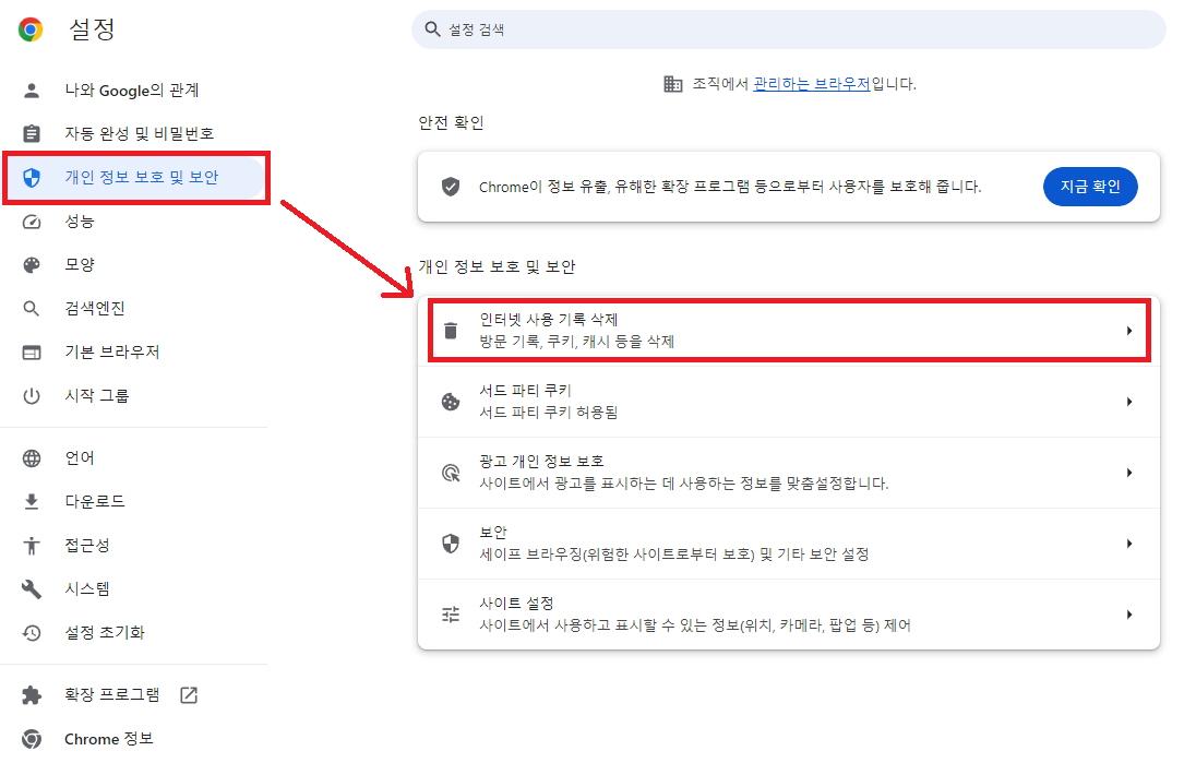 (3) 설정 좌측 '개인 정보 보호 및 보안'을 클릭 후 '인터넷 사용 기록 삭제'를 클릭해 줍니다.