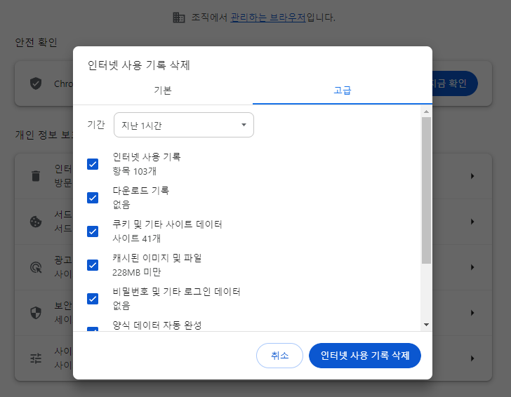 기본은 기본적인 방문기록, 로그인정보, 저장된 이미지 파일들을 선택 기간에 따라 삭제할 수 있습니다.
